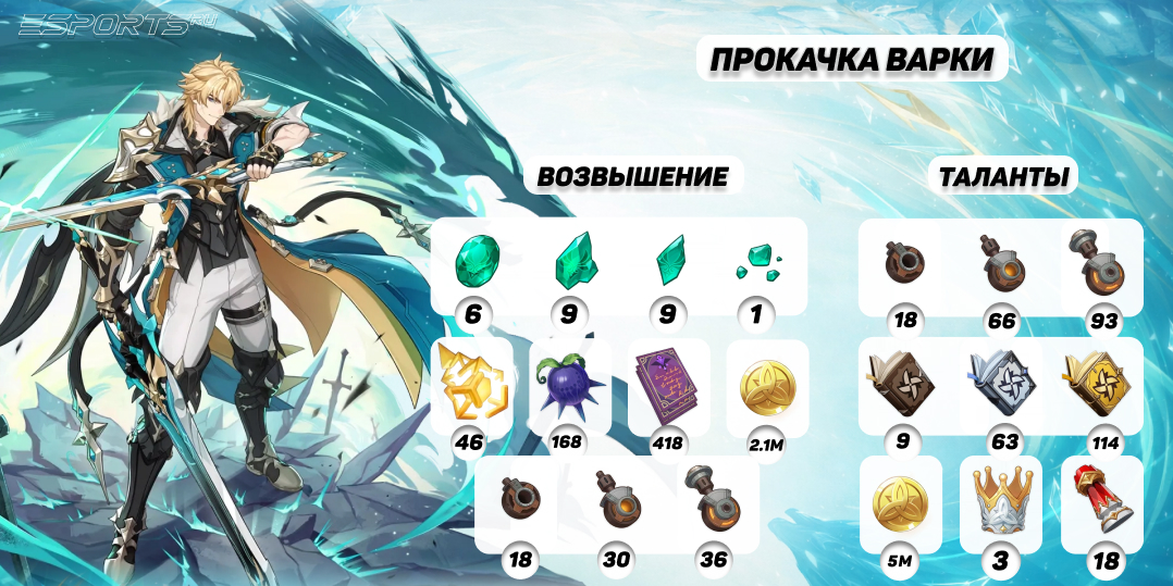 На представленном фото мы собрали все материалы прокачки Варка Для этого потребуется стандартный набор материалов, как и у других персонажей. Все, необходимое для возвышения персонажа и его талантов находится сразу в двух регионах — Мондштадт и Нод-Край. На фото указано количество материалов для возвышения до 90 уровня и талантами 10 уровня. Отдельно отметим приоритет прокачки талантов: