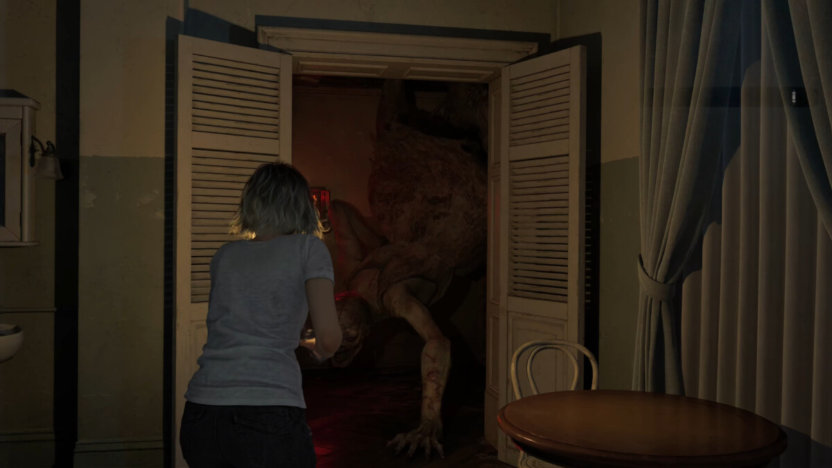 Но у этого приёма есть нюанс: если вы выстрелите в Девочку в узком проходе, она может упасть прямо на путь отхода и перекрыть дорогу. Чтобы избежать такой ситуации, лучше сначала выманить её в более просторную часть локации.