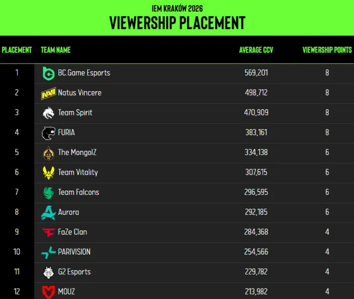 На IEM Krakow 2026 лидером по зрительской популярности стала команда BC.Game, чьи матчи с Александром “s1mple” Костылевым собрали в среднем 569,2 тыс зрителей. Второе место заняли Natus Vincere с 498,7 тыс, а замкнула тройку лучших Team Spirit — 470,9 тыс. В рейтинг поощрительной программы вошли 12 лучших команд по этой статистике.