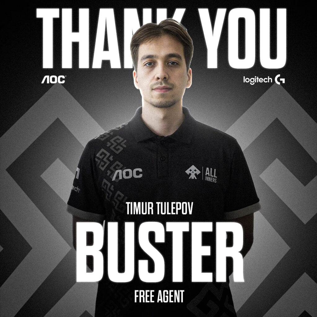 Тимур “buster” Тулепов присоединился к ALLINNERS в сентябре 2025 года. Вместе с командой он добился первых мест на Atyrau CyberCup 2025 и Contest Pro League Season 6, а также участвовал в квалификациях к IEM Rio 2026. На данный момент не известно, кто станет его заменой в составе.