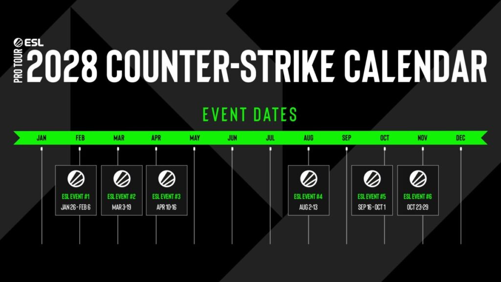 Организаторы киберспортивных соревнований ESL представили расписание турниров тир-1 в рамках ESL Pro Tour на 2028 год. В календаре значатся шесть крупных мероприятий. Об этом они сообщили в своих социальных сетях.