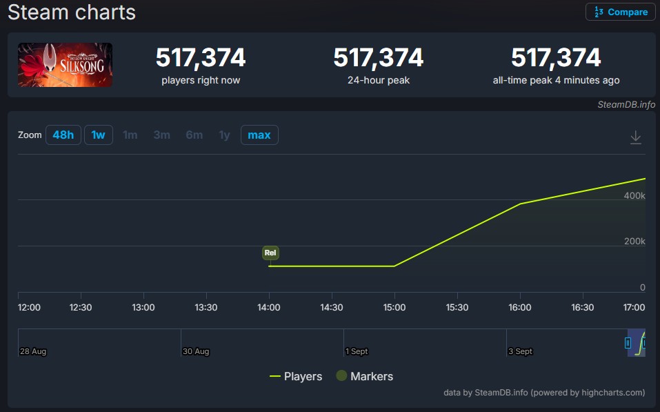 Метроидвания Hollow Knight: Silksong, вышедшая 4 сентября, достигла онлайна в 500 тыс. игроков. Спустя 4 часа после своего релиза количество одновременных пользователей достигло отметки более чем в полмиллиона.