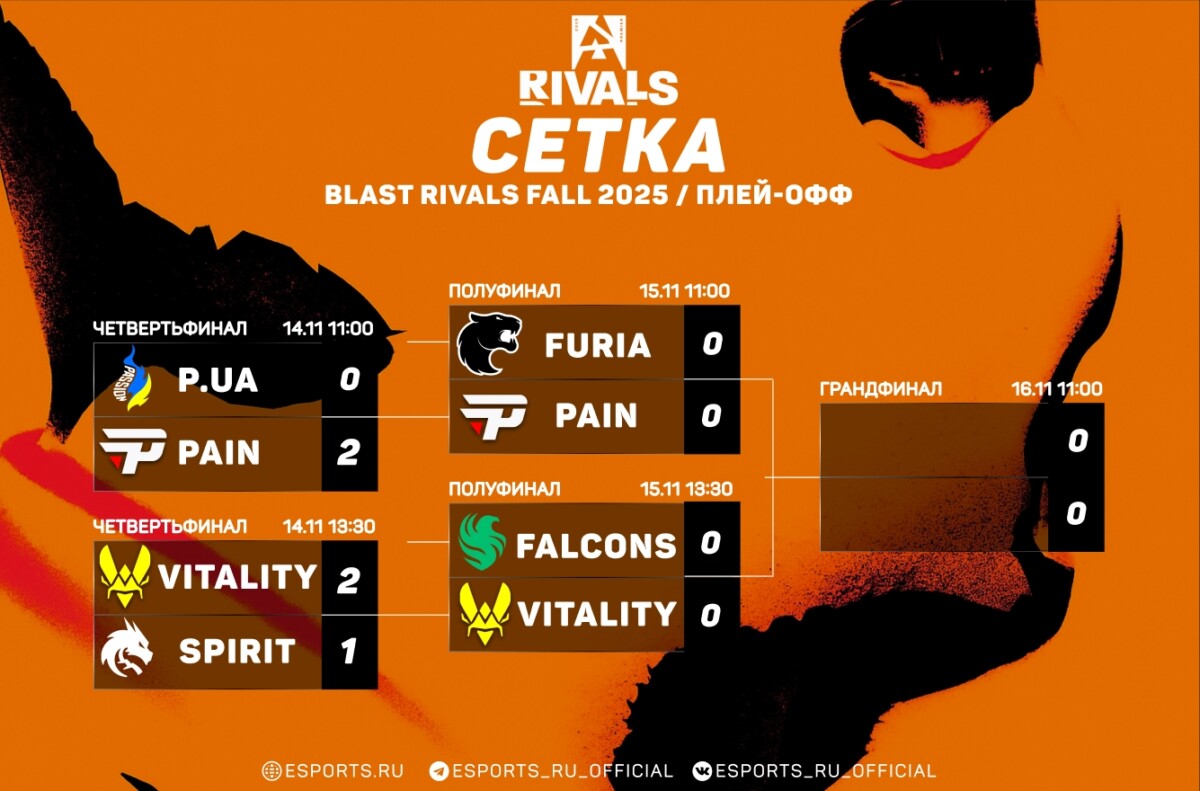 В пятницу, 14 ноября, состоялись матчи 1/4 финала BLAST Rivals 2025 Season 2. Было проведено два матча, по результатам которых определились команды, которые отправятся в пары к полуфиналистам, прошедшим в эту стадию напрямую из групп.
