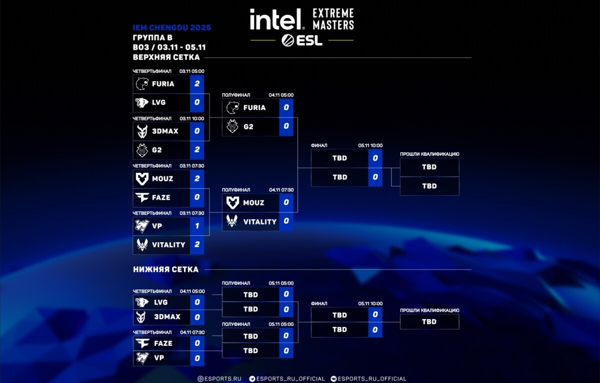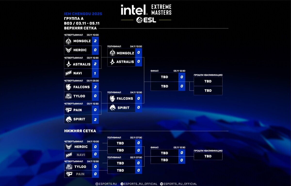 В понедельник, 3 ноября, прошел первый игровой день IEM Chengdu 2025. Было сыграно восемь матчей, по результатам которых четыре команды продолжили выступление в верхних сетках своих групп, и еще четыре отправились в нижние сетки.