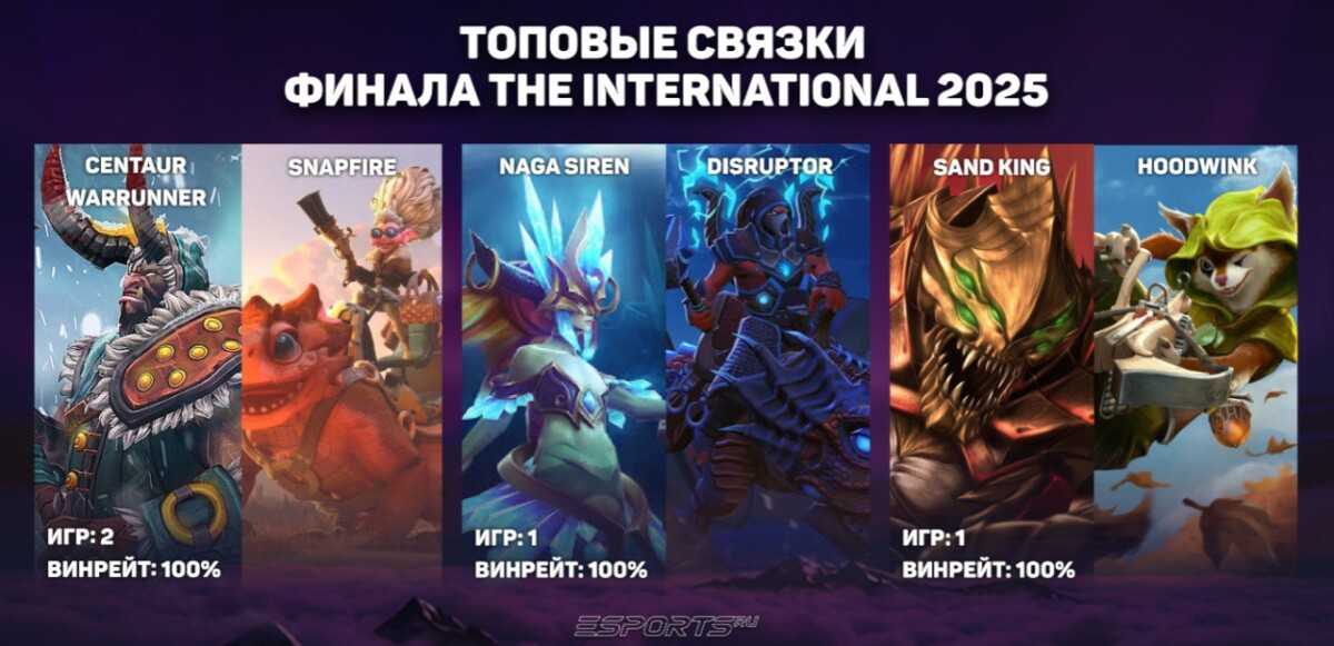 В финальном дне TI14 только одна связка героев повторилась: Snapfire и Centaur Warrunner, показали 100% винрейт за две игры. Все остальные комбинации появились уже в гранд-финале и стали ключевыми для побед на отдельных картах. Именно эти драфты позволяли командам выигрывать решающие сражения и закреплять преимущество в серии.