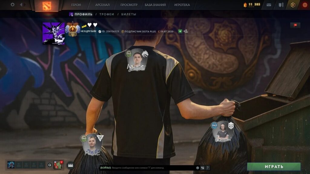 Изначально Мирослав заменил никнейм Артема “Niku” Бачкура на стикер Ивана “Pure” Москаленко, а на чёрные пакеты добавил два стикера Ильи “Yatoro” Мулярчука. Однако позже композиция была обновлена: теперь на картинке Yatoro “выносит на помойку” керри BetBoom Team и Алимжана “Watson” Исламбекова.