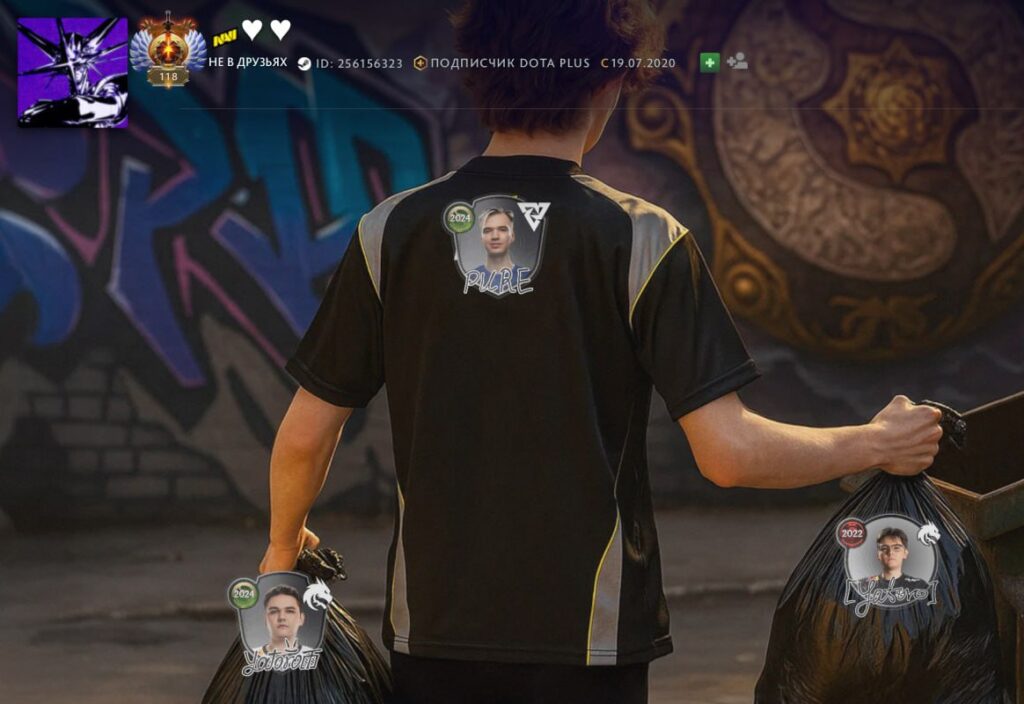 Саппорт Aurora Gaming по Dota 2 Мирослав “Mira” Колпаков разработал провокационный коллаж на основе загрузочного экрана из фирменного бандла Natus Vincere. Он творчески переработал сцену, добавив в неё известных киберспортсменов.