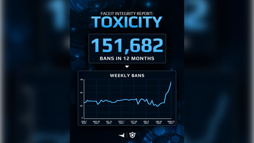 За последние 12 месяцев соревновательная платформа FACEIT заблокировала 151 682 аккаунта за токсичное поведение и нарушения правил общения во время матчей. При этом разработчики отмечают, что в 2026 году этот показатель может быть превзойдён: значительная часть недавних банов пришлась на февраль и март. Кроме того, количество еженедельных блокировок выросло на 169%.