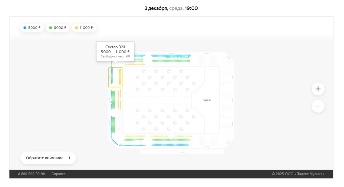 Стоимость одного билета стартует от ₽5 тыс. за обычное место и доходит до ₽11 тыс. за первые ряды. Тикет средней стоимости на 13-15 ряды можно приобрести за ₽8 тыс.