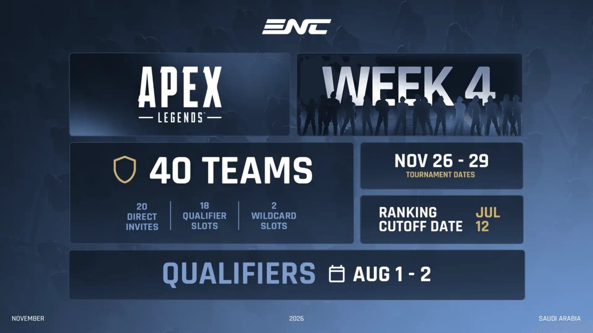 Турнир по Apex Legends станет частью программы чемпионата Esports Nations Cup 2026. Матчи пройдут с 8 по 15 ноября 2026 года в Эр-Рияд, Саудовская Аравия. Соответствующий анонс появился в официальных социальных сетях мероприятия.