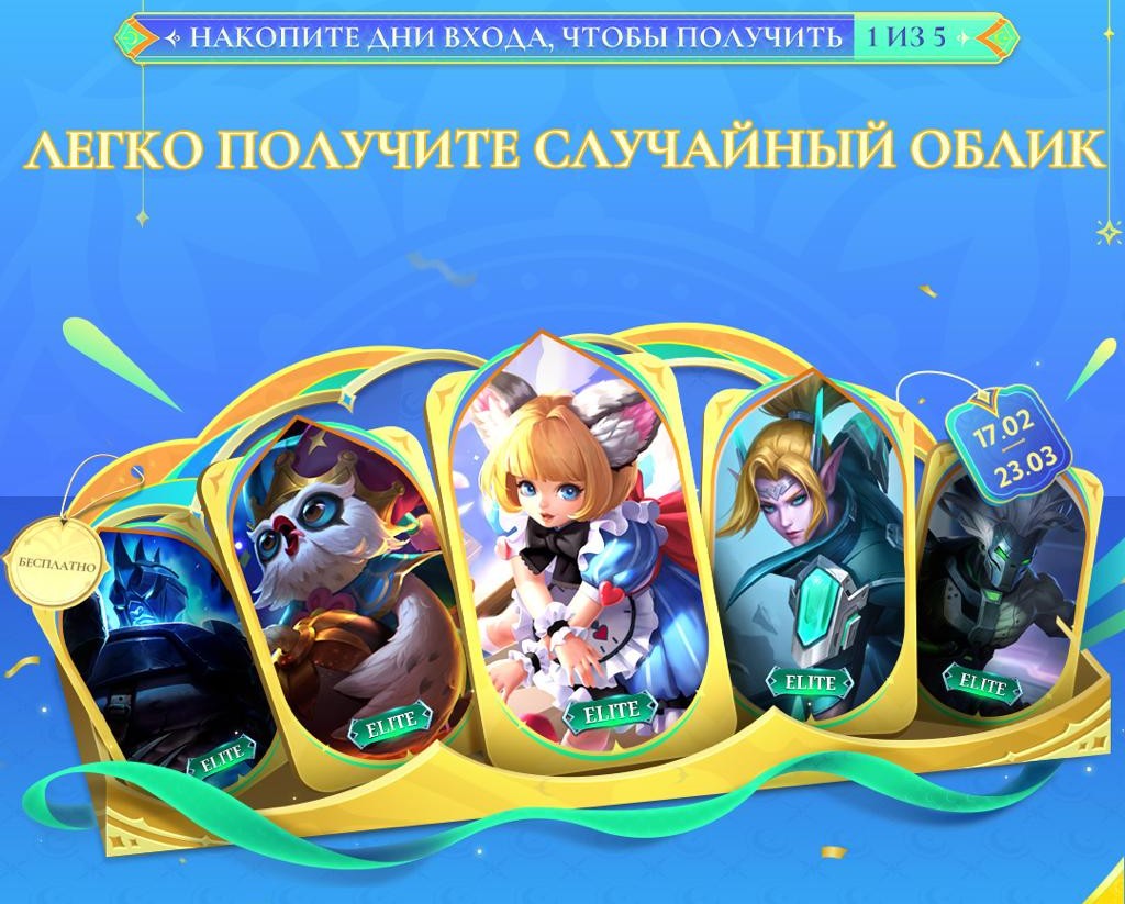 При входе в игру в указанный период можно получить один из пяти элитных обликов. Набор обликов фиксирован, распределение случайное.