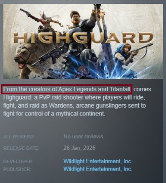 До релиза в описании в Steam указывалось, что игра создавалась командой разработчиков Apex Legends и Titanfall, однако уже спустя сутки эти упоминания исчезли. Пользователи связывают это с негативной реакцией аудитории, а по неподтверждённой информации, юристы Electronic Arts могли потребовать от авторов Highguard удалить ссылки на свои франшизы, чтобы имя компании не ассоциировалось с провальным проектом.