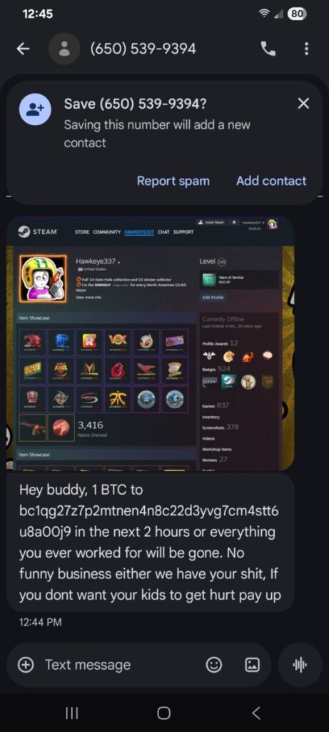 Взломщик потребовал выкуп в размере 1 BTC (~₽7 900 000), угрожая в случае отказа уничтожить ценные предметы. Когда перевод не поступил, хакер привел угрозу в исполнение — прикрепил редкие наклейки к стандартным скинам оружия, что фактически уничтожило их коллекционную ценность.