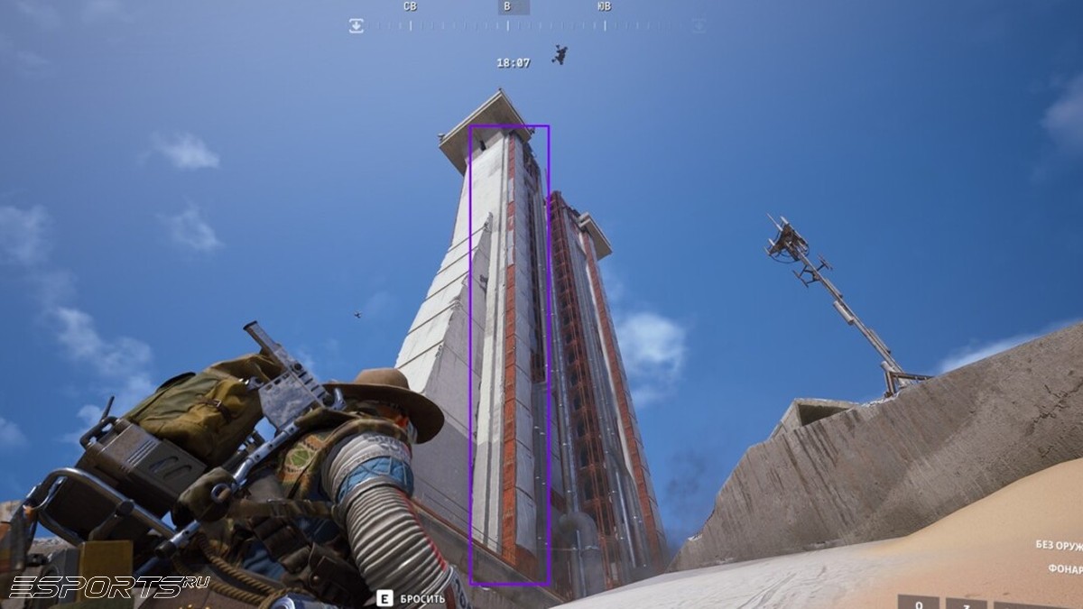❗Обратите внимание: также на вершину Пусковой башни можно забраться с помощью Крюка с защёлкой (Snap Hook). Это долгий, но относительно безопасный способ в ситуации, когда вокруг много снайперов и “АРКов”. Для этого потребуется подтягиваться на троссе с одного балкона на другой между двумя внутренними сегментами башни.