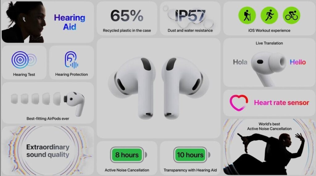 Новинка отличается от предыдущей версии более эффективным шумоподавлением. По словам создателей, он стал в четыре раза эффективнее по сравнению с первой версией AirPods Pro. Наушники также научились переводить речь благодаря Apple Intelligence.
