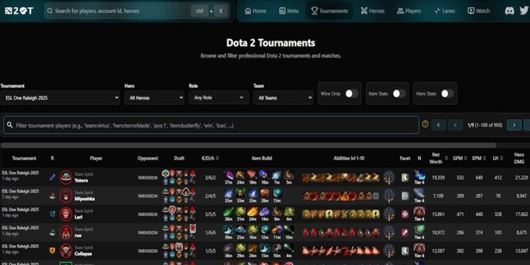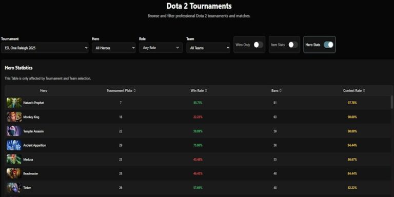 Источник: Dota2ProTracker. Подробная статистика прошедших игр с Esl One Raleigh 2025 и общая статистика персонажей на ивенте