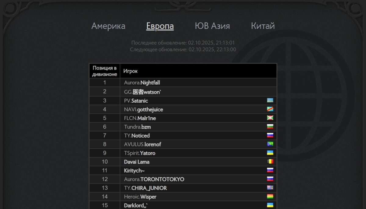 Керри Aurora Gaming Егор “Nightfall” Григоренко вышел на первую строчку европейского ладдера по Dota 2. Он достиг отметки в ~17 150 MMR. На втором месте расположился керри Gaimin Gladiators Алимжан “watson” Исламбеков, а на третьем — молодой талант из PARIVISION Алан “Satanic” Галлямов.