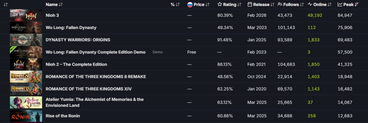 Согласно данным сервиса SteamDB, к моменту написания материала количество одновременных пользователей в Nioh 3 почти достигло 85 тыс, что стало лучшим результатом в истории франшизы. Для сравнения: оригинальная Nioh при релизе на ПК в 2018 году показала пик в 10 649 игроков, а Nioh 2 в 2021 году достигла отметки 41 325. Таким образом, Nioh 3 стала самой популярной игрой серии на ПК, а также самым успешным релизом Koei Tecmo в Steam по показателю пикового онлайна.