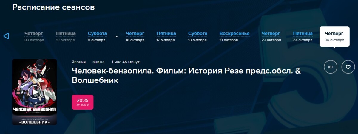 Премьера аниме-фильма “Человек-бензопила: История Резе” в России состоится 30 октября 2025 года. В большинстве кинотеатров билеты можно приобрести уже сейчас. Стоимость посещения стартует от ₽400, но может значительно варьироваться в зависимости от региона.