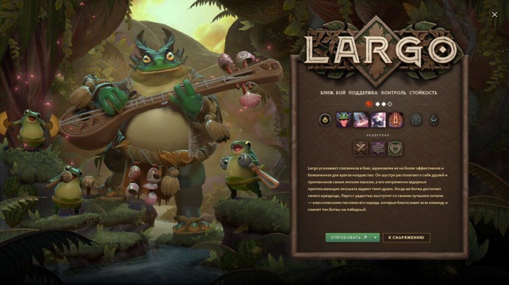 Largo рассчитан на позицию поддержки и лучше всего раскрывается в затяжных командных сражениях, где может одновременно контролировать противников и усиливать союзников.