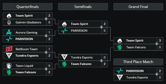 | 5-8 | 200 | $125 000 | Gaimin Gladiators Aurora Gaming BetBoom Team – |