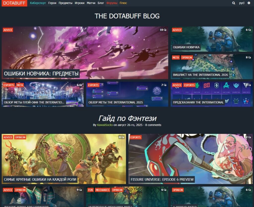 Dotabuff также включает в себя разделы “Блог” и “Форумы“, которые формируют активную часть сообщества сайта. В блоге регулярно публикуются статьи редакции, посвящённые обучению игроков, анализу меты, гайдам, обзорам турниров и разборам профессиональных матчей. Здесь можно найти полезные материалы как для новичков, так и для опытных игроков, желающих глубже разобраться в механиках игры.