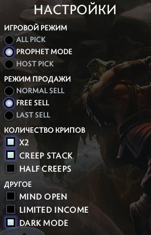 - Half Creeps — волны крипов имеют половину количества, но вдвое больше здоровья и урона.